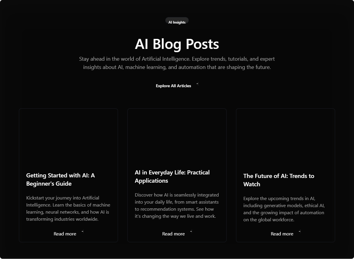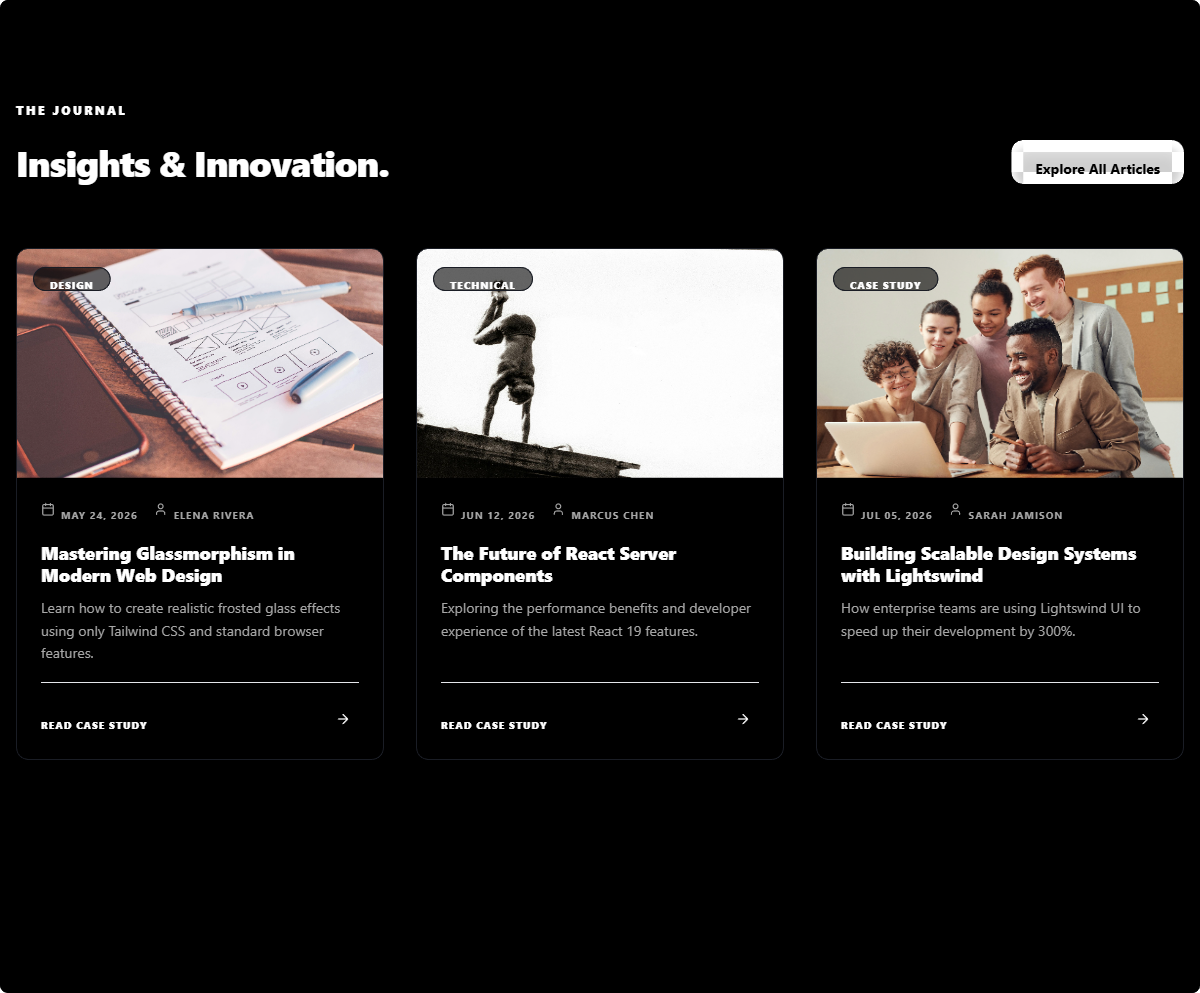 A visually rich blog grid featuring card hover effects, glassmorphic overlays, and metadata badges. Optimized for showcasing high-quality editorial content.