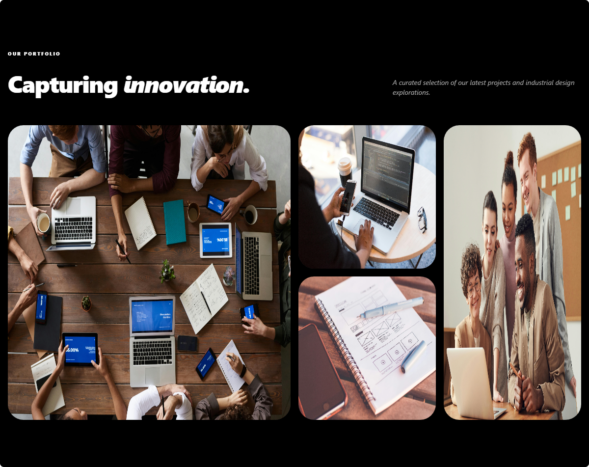 A classic masonry image gallery that adapts to different image aspect ratios. Features a hover overlay for project titles and categories.