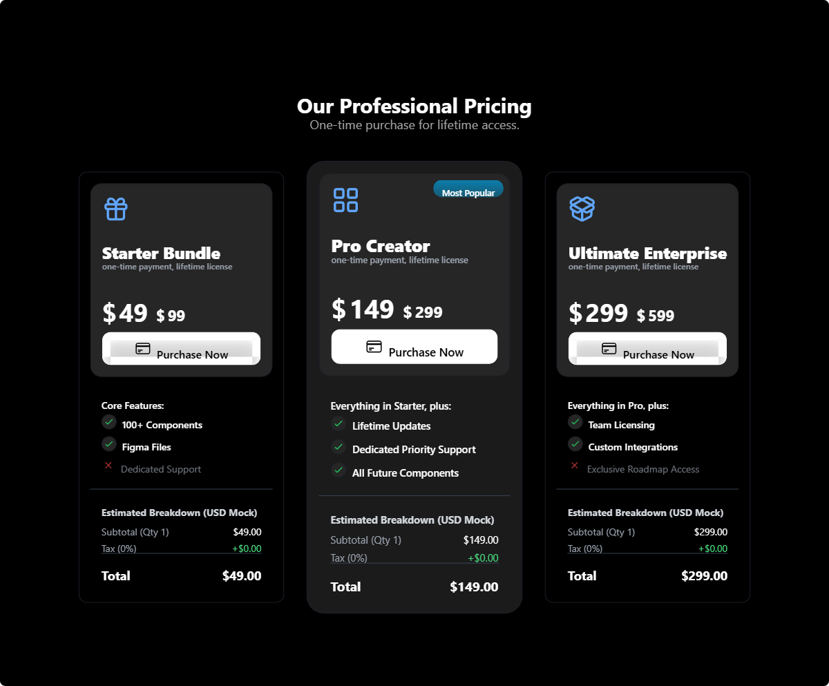 Conversion-optimized pricing tables and comparison charts. Clean, trustworthy designs that help users understand value and make purchasing decisions.