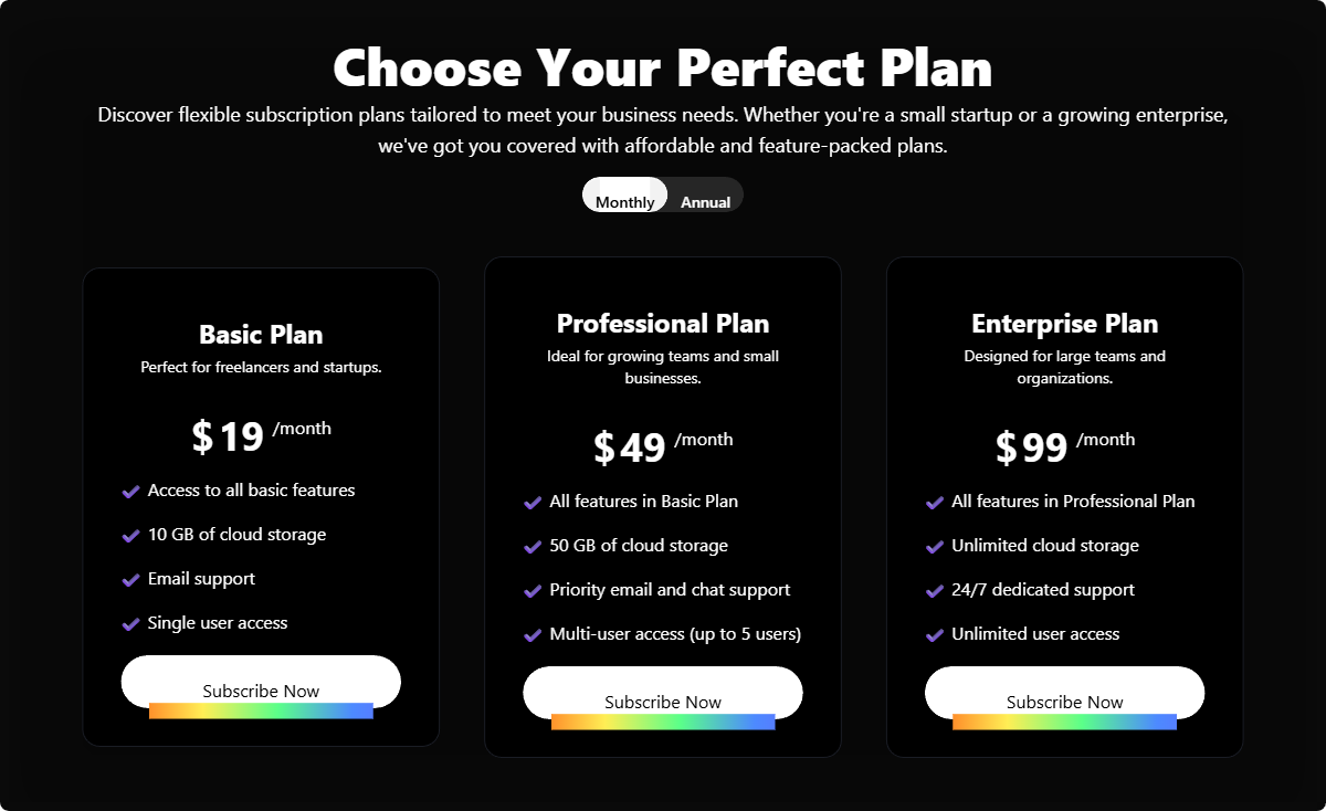 A clean pricing section with a prominent monthly/yearly toggle. Highlights savings to encourage annual subscriptions and uses a card-based layout.