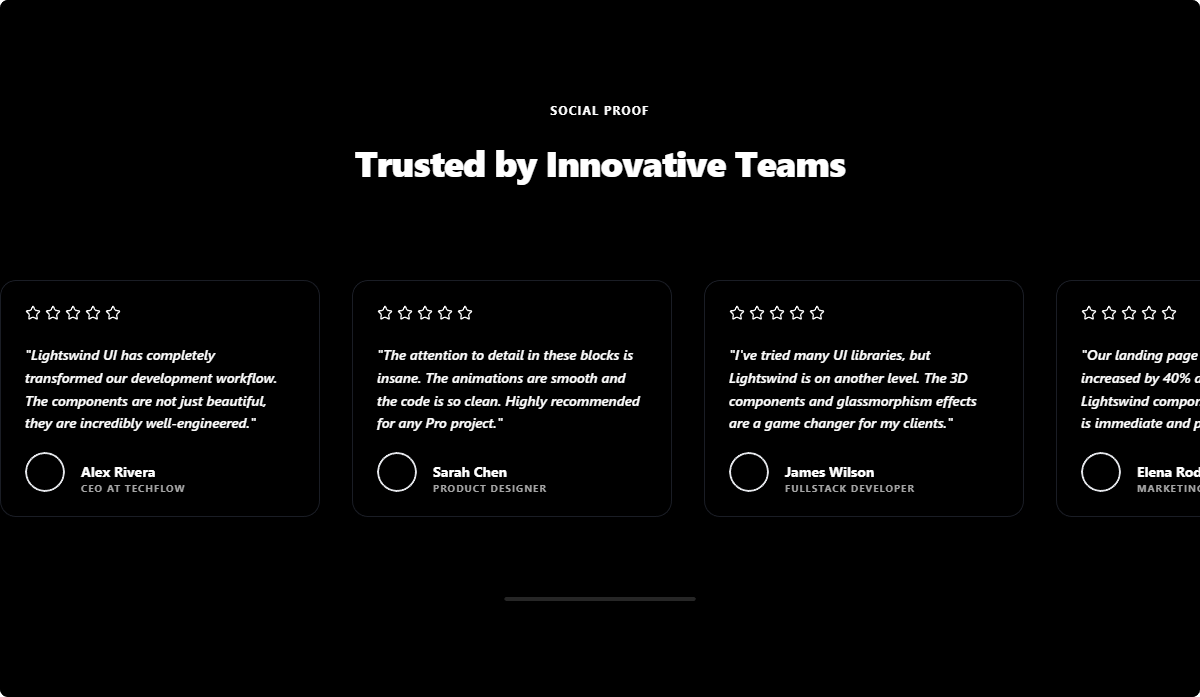 A smooth, auto-scrolling testimonial marquee that pauses on interaction. Perfect for showcasing a high volume of client feedback in a compact, dynamic strip.