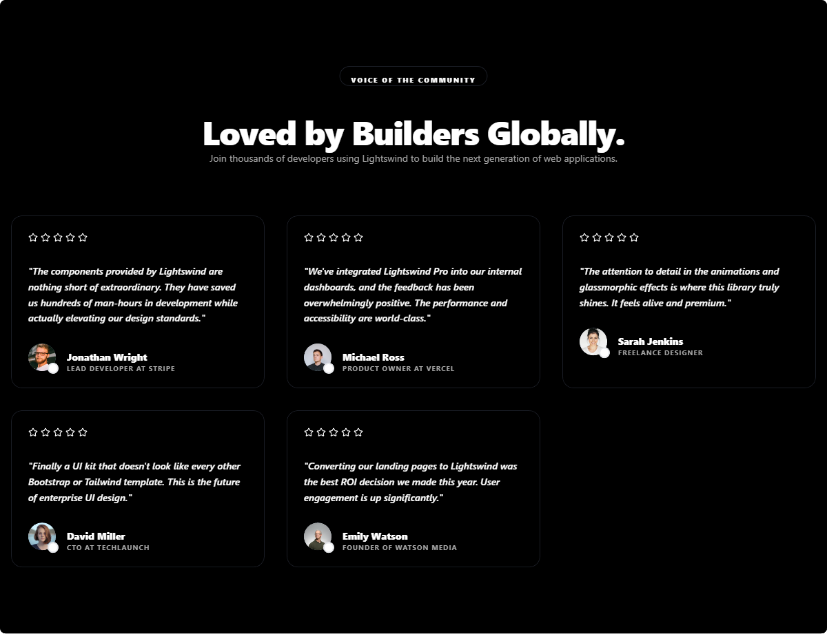 Persuasive testimonial grids and sliders to showcase customer success. build authority and reduce hesitation with authentic social proof.